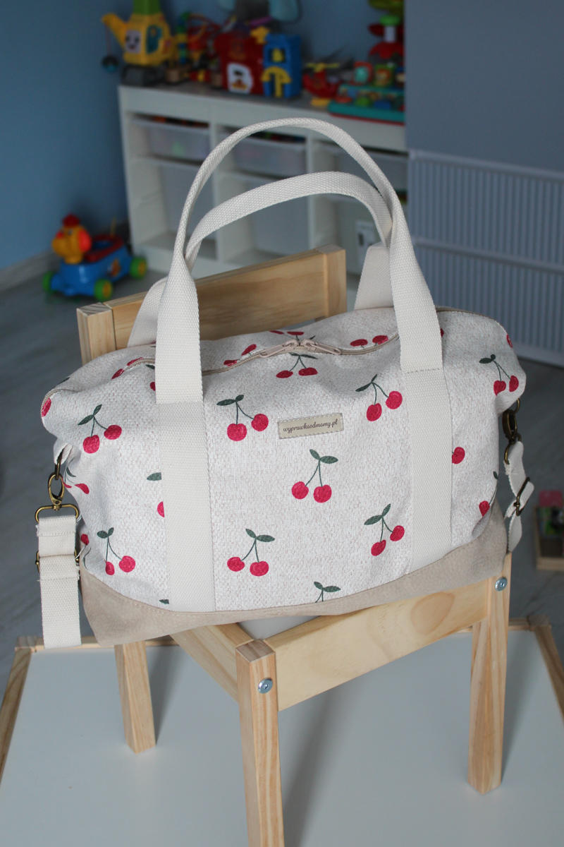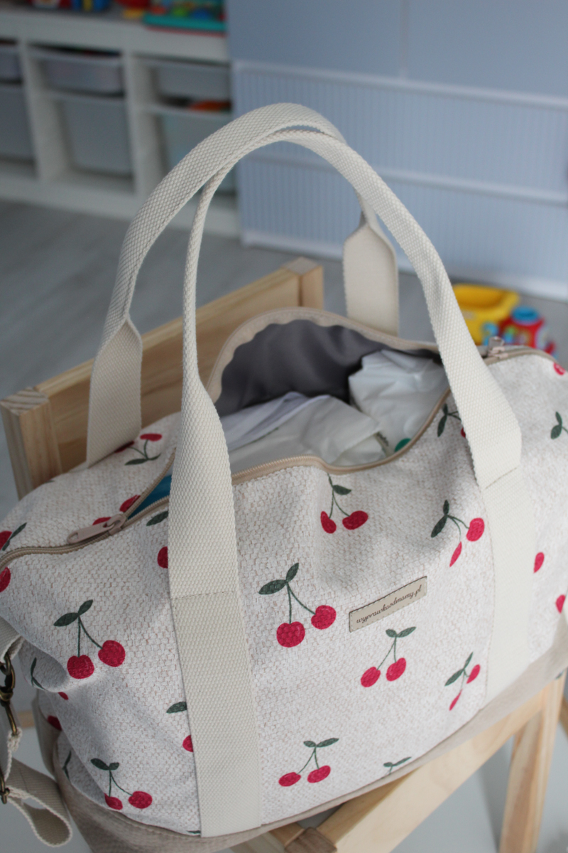 Uroczy wzór w wiśnie będzie swobodnie nosić zarówno mama, jak i tata. Torba z wyprawką składa się z pojemnej przegrody zamykanej na zamek błyskawiczny i dodatkowej kieszonki w środku, również na zamek. Oprócz wszytych uchwytów do noszenia torby w ręce, w zestawie jest długi regulowany pas na ramię i komplet uchwytów, dzięki którym przypniesz torbę do rączki każdego wózka dziecięcego.